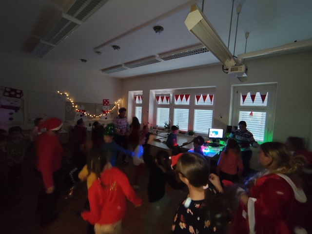 Po uradnem delu se je začela prava novoletna zabava. Ob modernih glasbenih ritmih je bilo veliko plesa, smeha in dobre volje. Nastal je plesni vlak, otroci so skakali, se vrteli in brezskrbno uživali v skupnih trenutkih. Veselje in sproščenost sta napolnila šolske prostore.